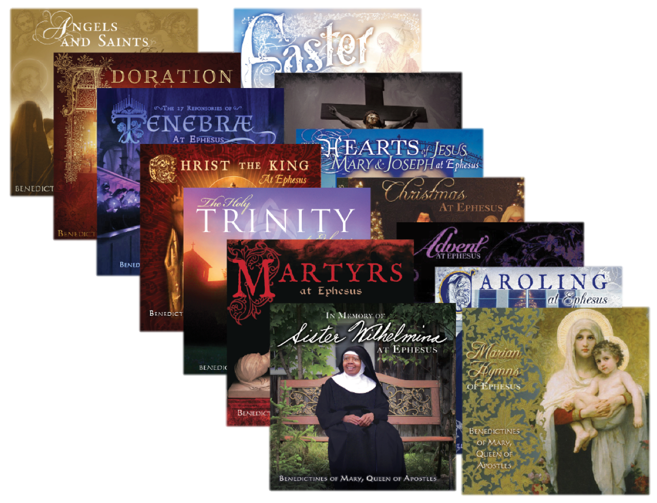 This set of all our CDs includes: Advent at Ephesus, Christmas at Ephesus, Caroling at Ephesus, Angels and Saints at Ephesus, Lent at Ephesus, Easter at Ephesus, Marian Hymns at Ephesus, Adoration at Ephesus, Hearts of Jesus, Mary and Joseph at Ephesus, Christ the King at Ephesus, Tenebrae at Ephesus, The Holy Trinity at Ephesus, Martyrs at Ephesus, In Memory of Sr. Wilhelmina at Ephesus.